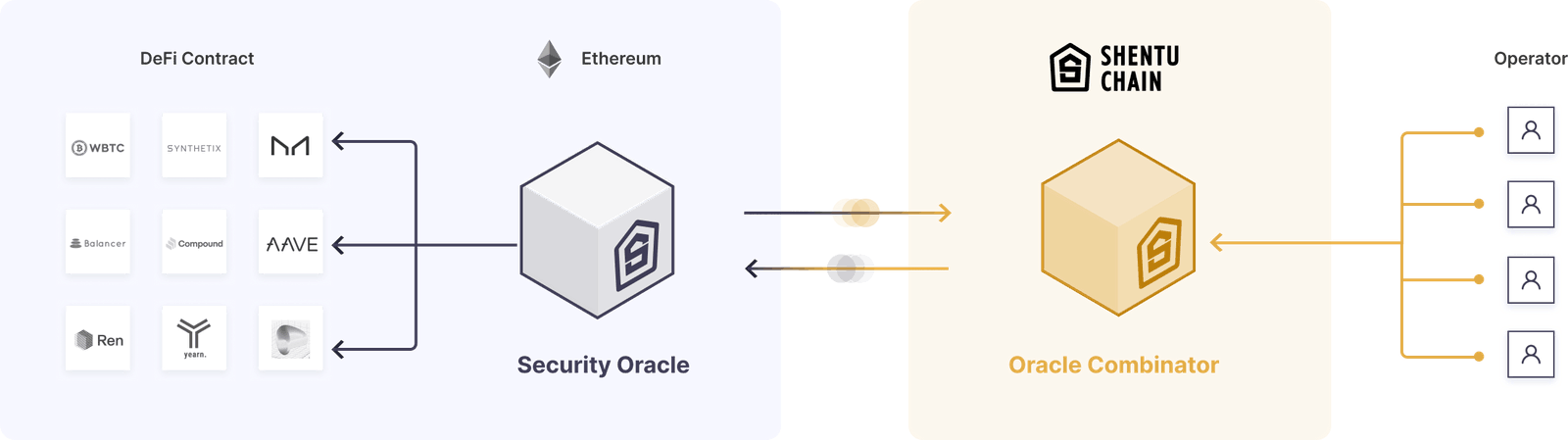 - Business Chain: The targeted blockchain platform, Ethereum, where Shentu Chain provides the Security Oracle. This chain includes a security oracle interface that accepts security inquiries from DeFi applications for upcoming transactions.