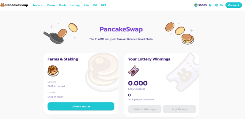 Besides the exchange, the platform also offers a PancakeSwap Lottery, and you can earn $CAKE with yield farms, staking and Syrup pools. In the lottery, you win the jackpot (50% of the entire pool) by matching all four numbers of your tickets in the same position as the winning four numbers. If you match just two or more numbers in the right position, you also win a reward.