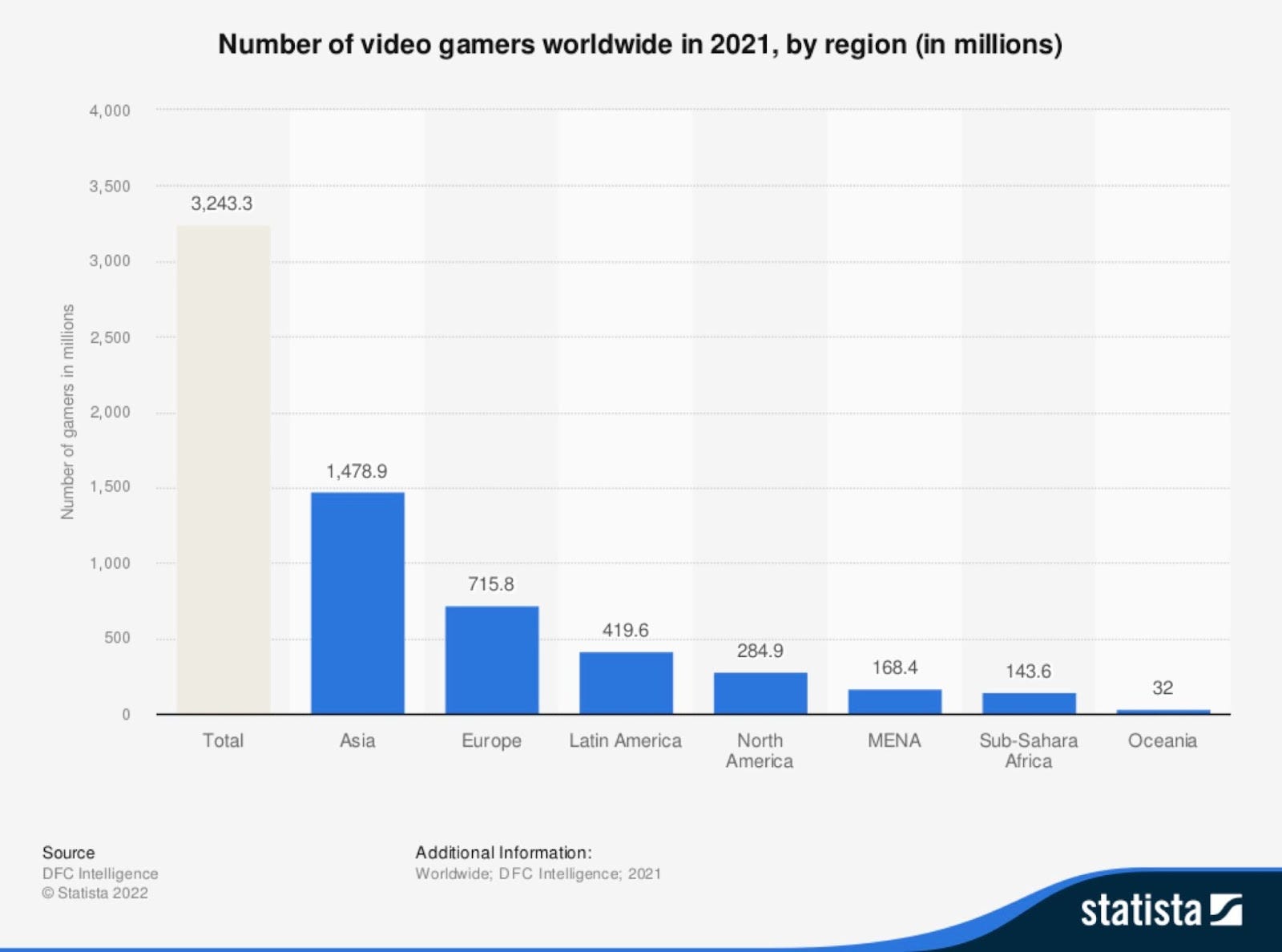According to DFC Intelligence, in 2021, there were over 3.2 billion gamers globally – the aperture of offering is very narrow for what's out there today on P2E games. That will continue to get bigger over time as people develop different types of games. There isn't one size fits all; blockchain games will serve a significant portion of the total gaming audience, but not all of it.