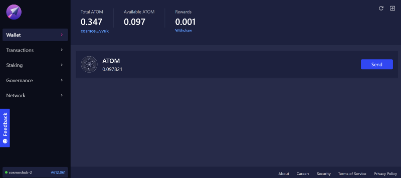 Now, you only need to send some ATOM to your address and go to the staking page in order to find the list of validators.