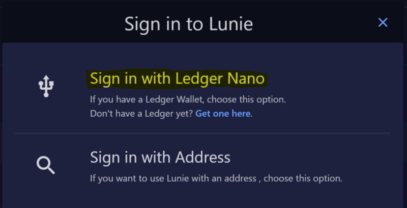 First, you will need to sign in using the previous wallet you created on your Ledger.