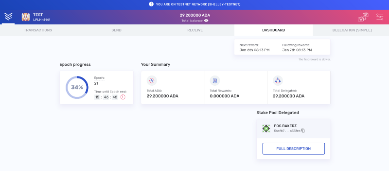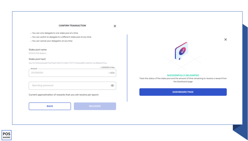 If the transactions failed that’s mean you need to try the process again. Once it has worked, POS Bakerz or the staking pool you’ve chosen will appear on your Dashboard under “Stake Pool Delegated”.