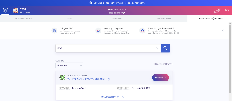 You will be able to find a list of famous stake pool to delegate. If you would like to delegate to us, our Cardano staking pool ticker is POS1 or you can also type POS Bakerz on the research bar.