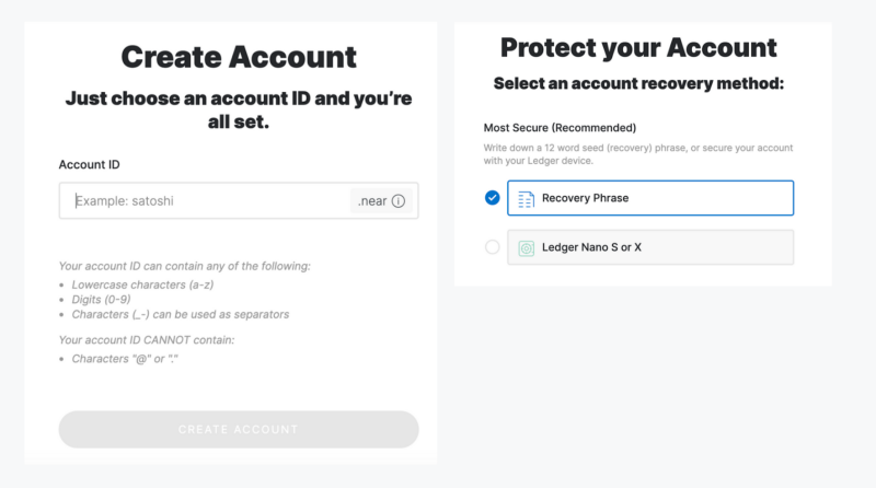 Next, you have to think of an account ID. Fill the form out and select “Create Account”. Next, choose a way that you would like to protect your account. It is possible to select from a seed phrase, connecting your Ledger, or using email or phone recovery. We would recommend using either a seed phrase or your Ledger as these options are more secure. For this tutorial, we are using the seed phrase.