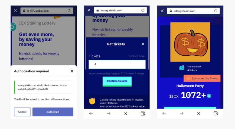You will be asked to authorize the DApp to make changes to your wallet. Select “Authorize” to continue. Then, select the number of tickets that you’d like to buy. Remember, 1 ICX equals one ticket. When ready, select “Confirm Tickets”. You will automatically be enrolled in the next lottery (see image on the right). So, all you’ll have to do is wait and check-in once the lottery ends to see what you’ve won! 🤑 🤑