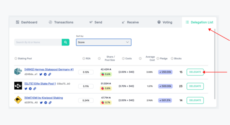 Once you have your assets in your account, it’s time to delegate them to a pool. Once again, on the top menu, select “Delegation List” on the far right. Scroll through the pools and select the one of your choices, or add the ticker name to find your preferred pool right away.