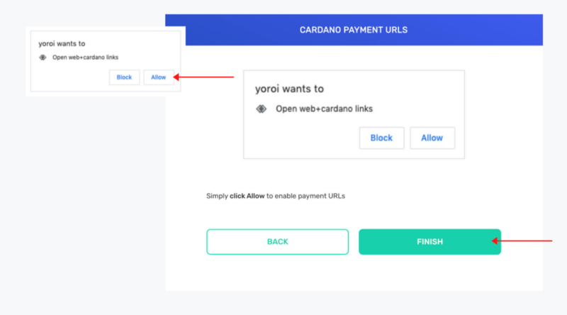 Next, you will need to make sure that Yoroi has access to the open web and Cardano network. Select “Allow” in the pop-up to continue. Next, select “Finish” to finalize the process.