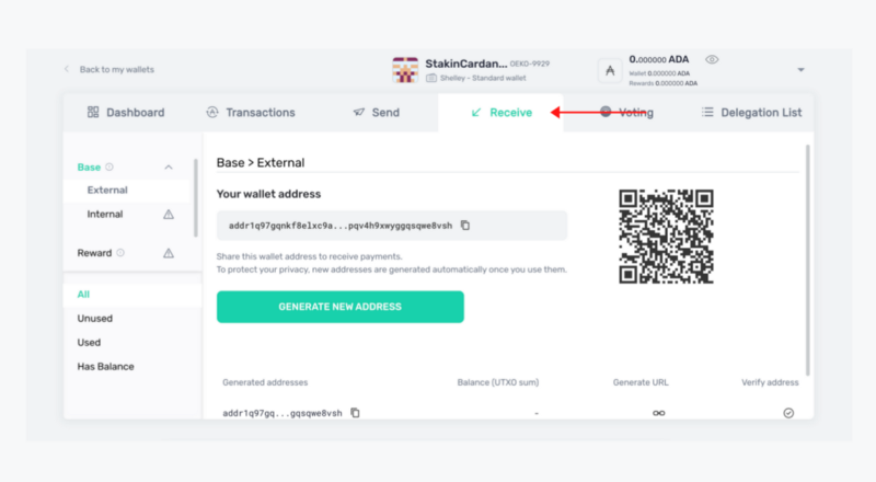 You will now need to make sure that you have your $ADA assets in your account before you can start staking or delegating. Thus, in the top menu select “Receive”. Copy the wallet address or scan the QR-code to transfer assets from any other wallet or exchange to your Yoroi Wallet.