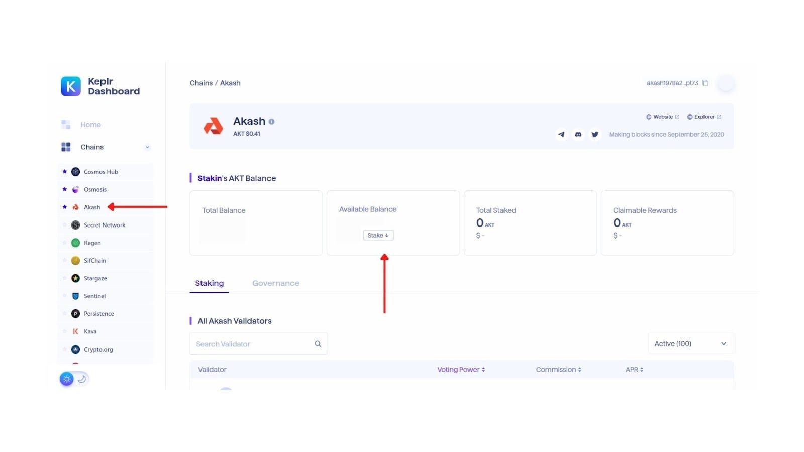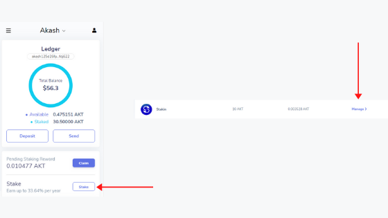 On the left side of the screen, select ‘Akash’ and then ‘Stake’ (see image below).