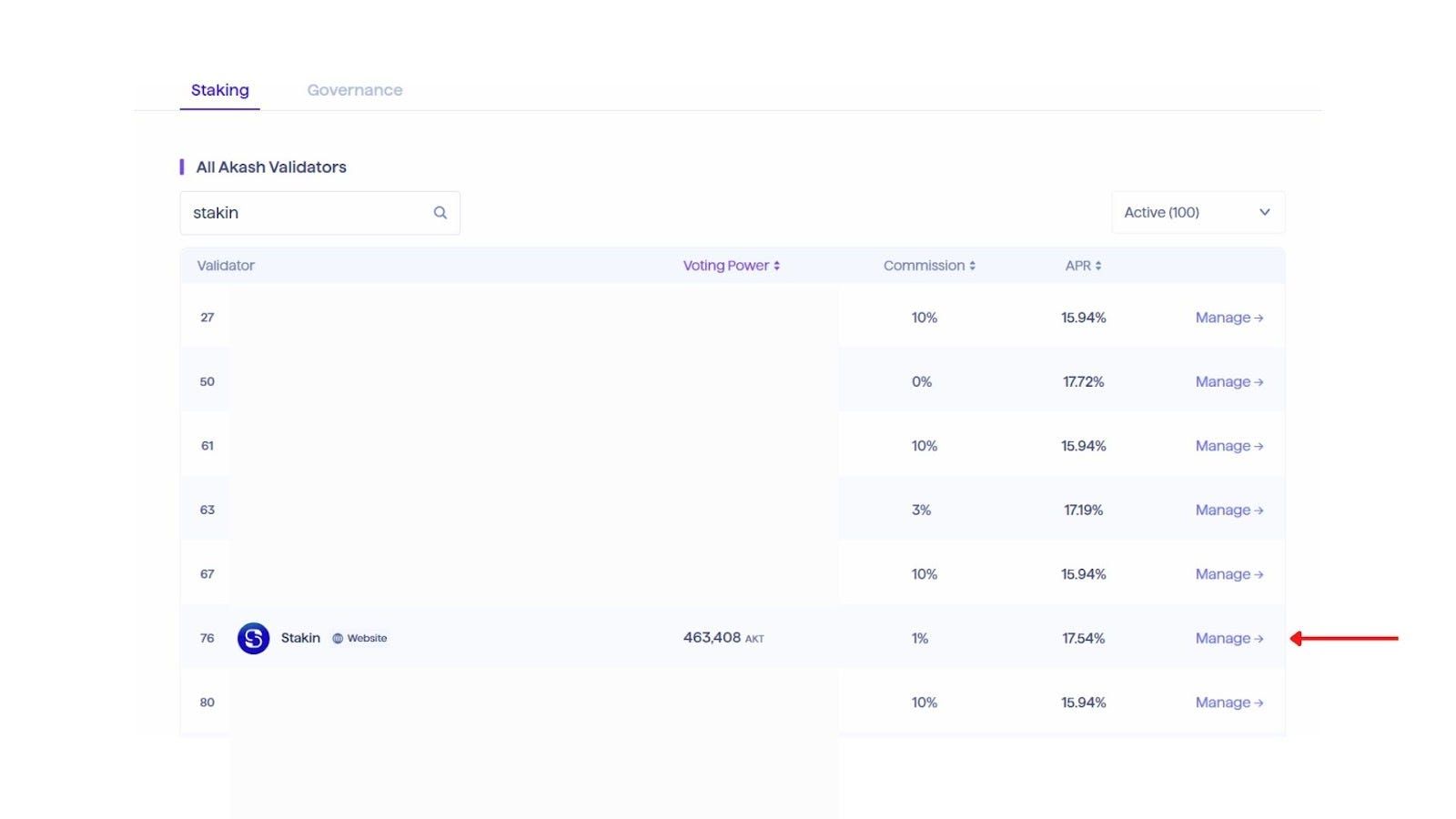 After selecting ‘Stake’, the validator list is shown. You can type the name of your preferred validator or scroll down. Then, select ‘Manage’ on the right side of their name.