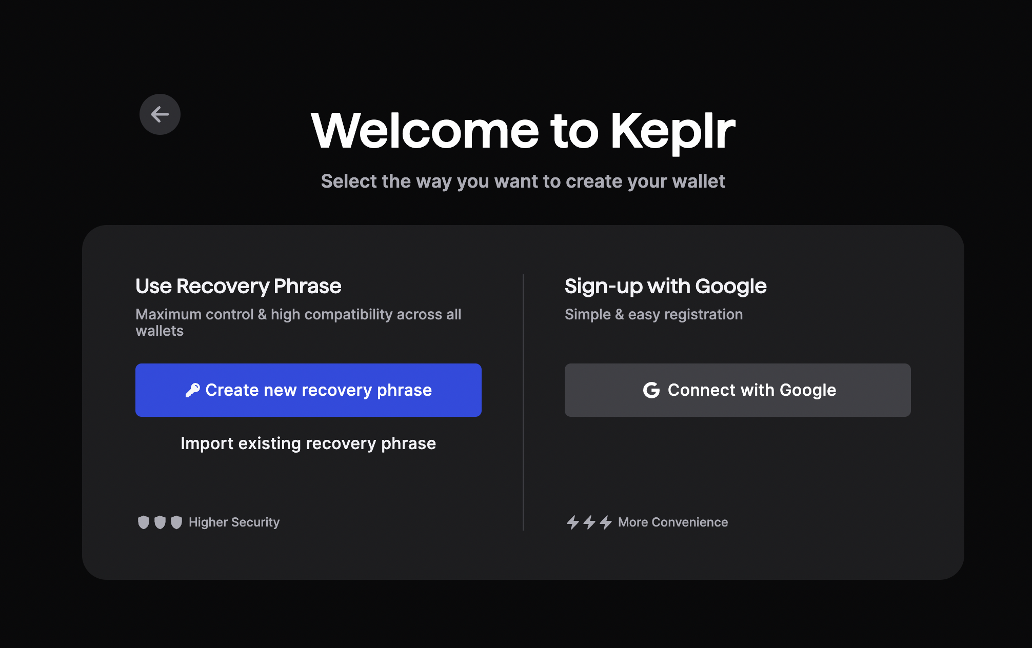 If you’ve selected “Create New Account”, Keplr will ask if you’d like to have a Mnemonic Seed of 12 or 24 words. Remember to store your seed phrase securely offline and never share it with anyone. If you lose your seed phrase, you will lose the assets within the wallet.