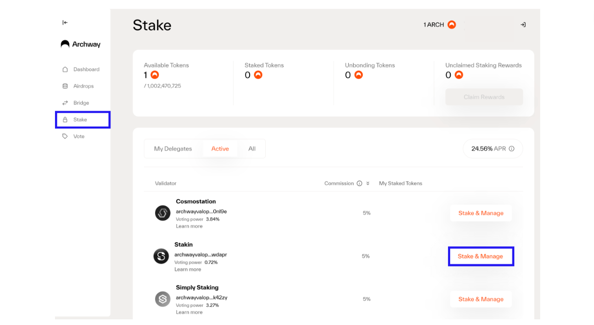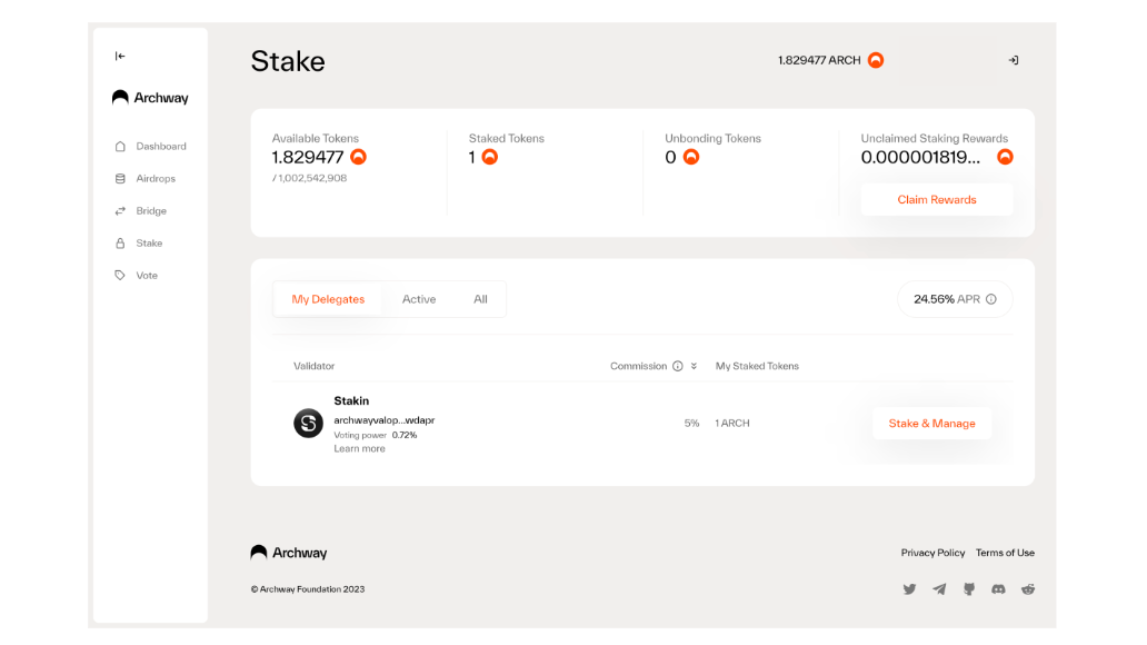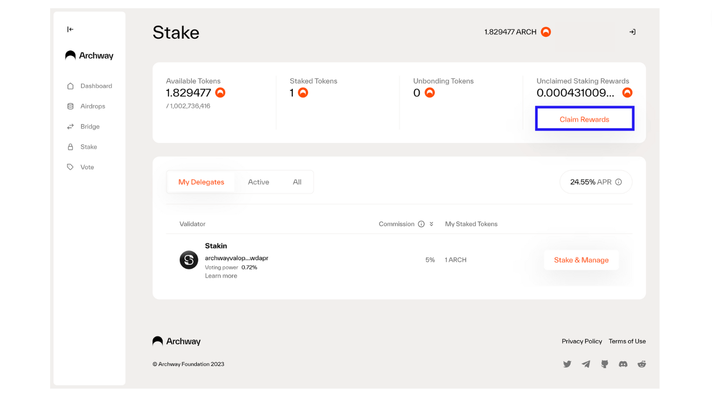 Once you’ve staked and started earning rewards, you can claim those rewards to either participate in other activities in the Archway ecosystem with them, restake, or simply HODL.