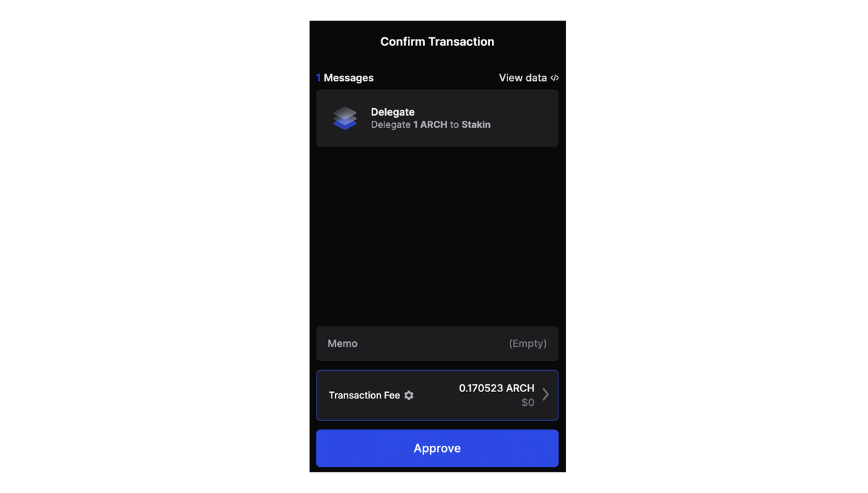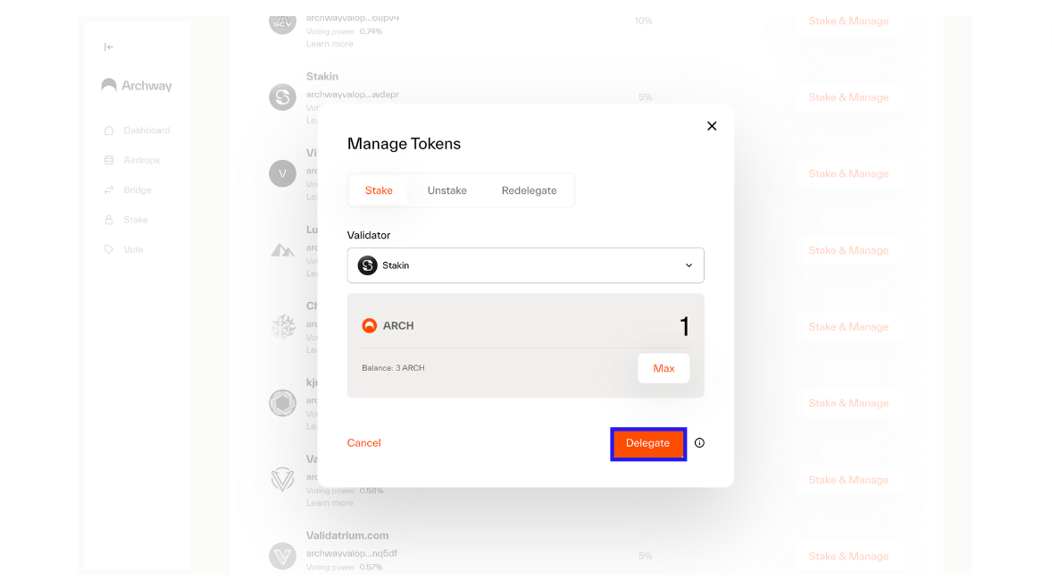 Once selected, confirm the number of $ARCH that you’d like to stake with the validator. Remember that you’ll need to save some $ARCH for future fees. Next, select “Delegate”.