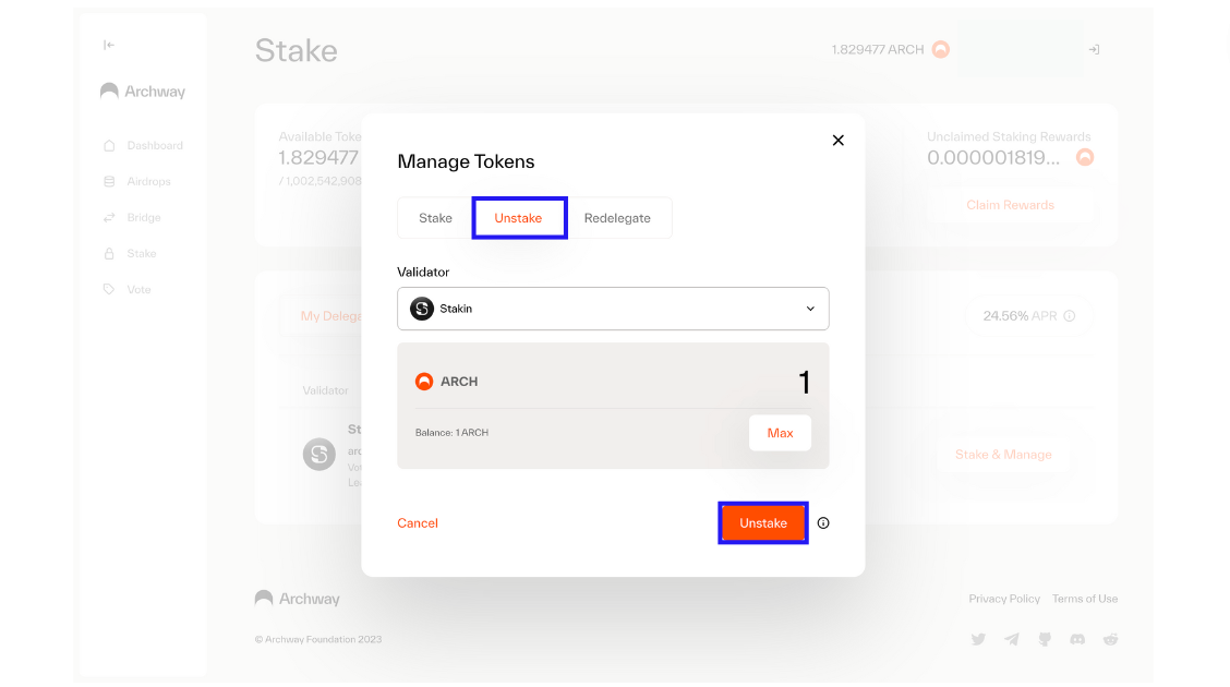 Unstaking or unbonding $ARCH takes 21 days. During this time, you’re not able to access your digital assets. If you want to earn extra rewards on your staked assets, you can claim and restake your earned rewards.