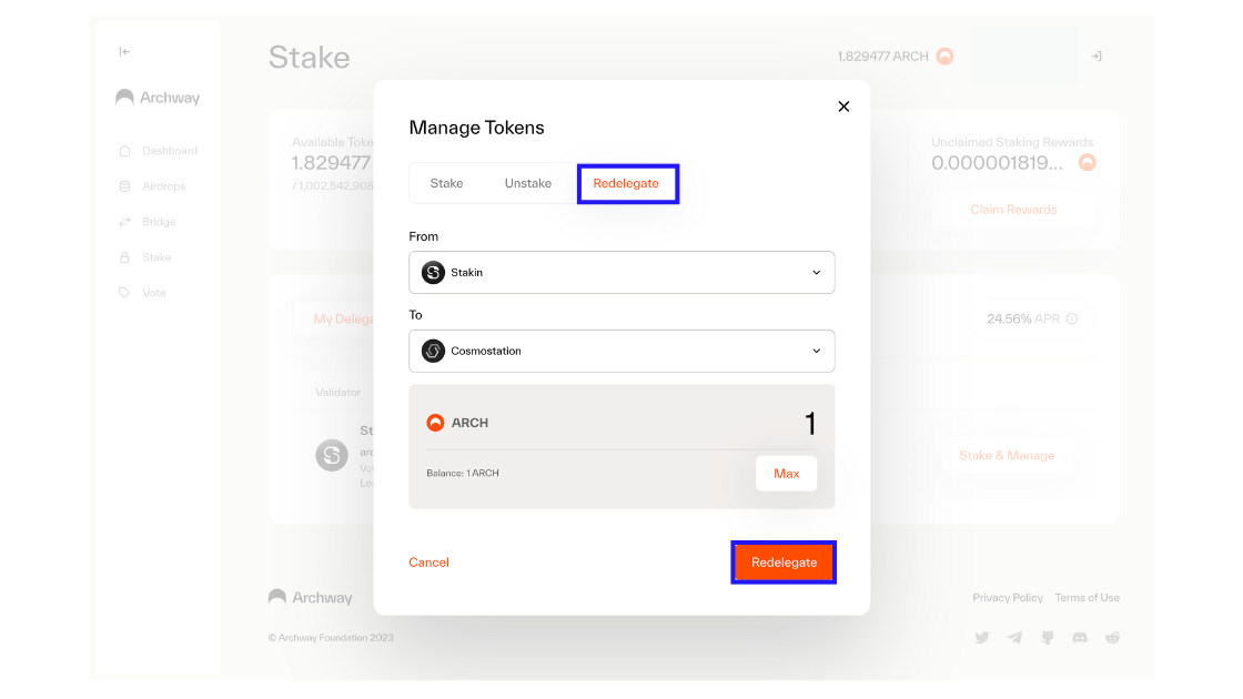 To restake. Select the validator that you’re currently staking with. Then in the pop-up, select “Redelegate”. You can now choose from and to which validator you’d like to redelegate. Add the amount you’d like to redelegate and select “redelegate”. Confirm the transaction in your wallet, and that’s all. You’ve now restaked your $ARCH.