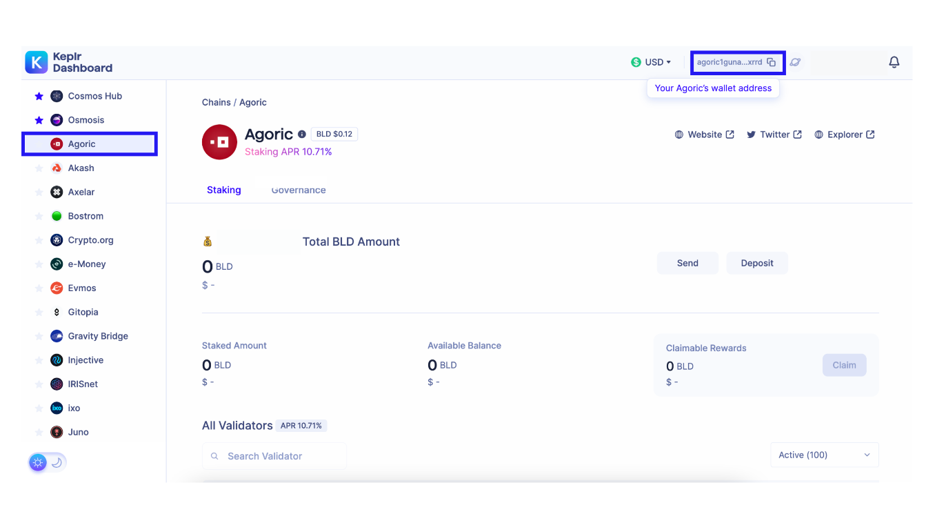 Deposit $BLD by selecting "Agoric" on the Keplr Dashboard's left menu (see image below) and copy your Agoric wallet address on the top right.