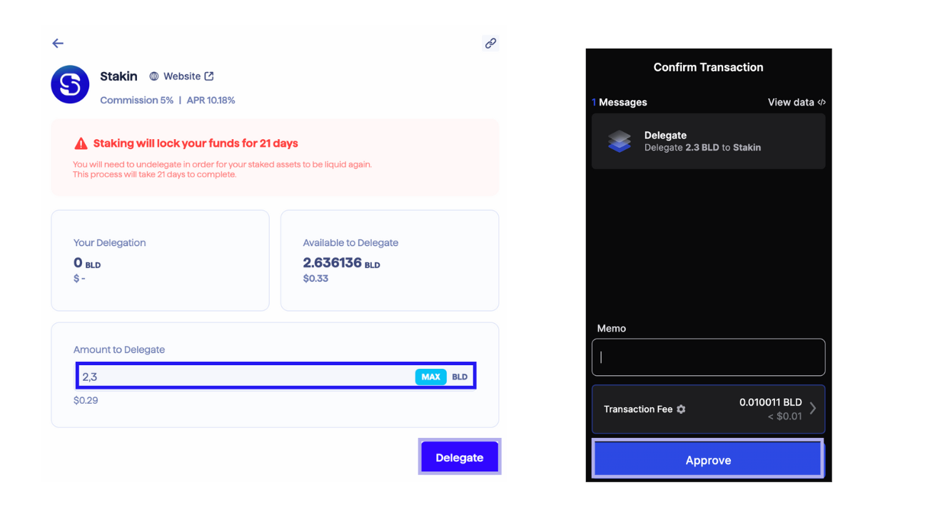 In the pop-up, select the amount you'd like to delegate (keep some $BLD for transaction fees) and select "Delegate". Confirm the transaction and add a memo if desired; next, select "Approve" to finalize the transaction.