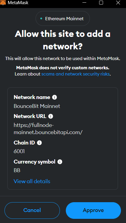 Finally, you will be prompted to add BounceBit to Metamask. Click “Approve.” If your Metamask is set to Ethereum by default, the next popup will prompt you to switch to BounceBit mainnet. Click “Switch network.”