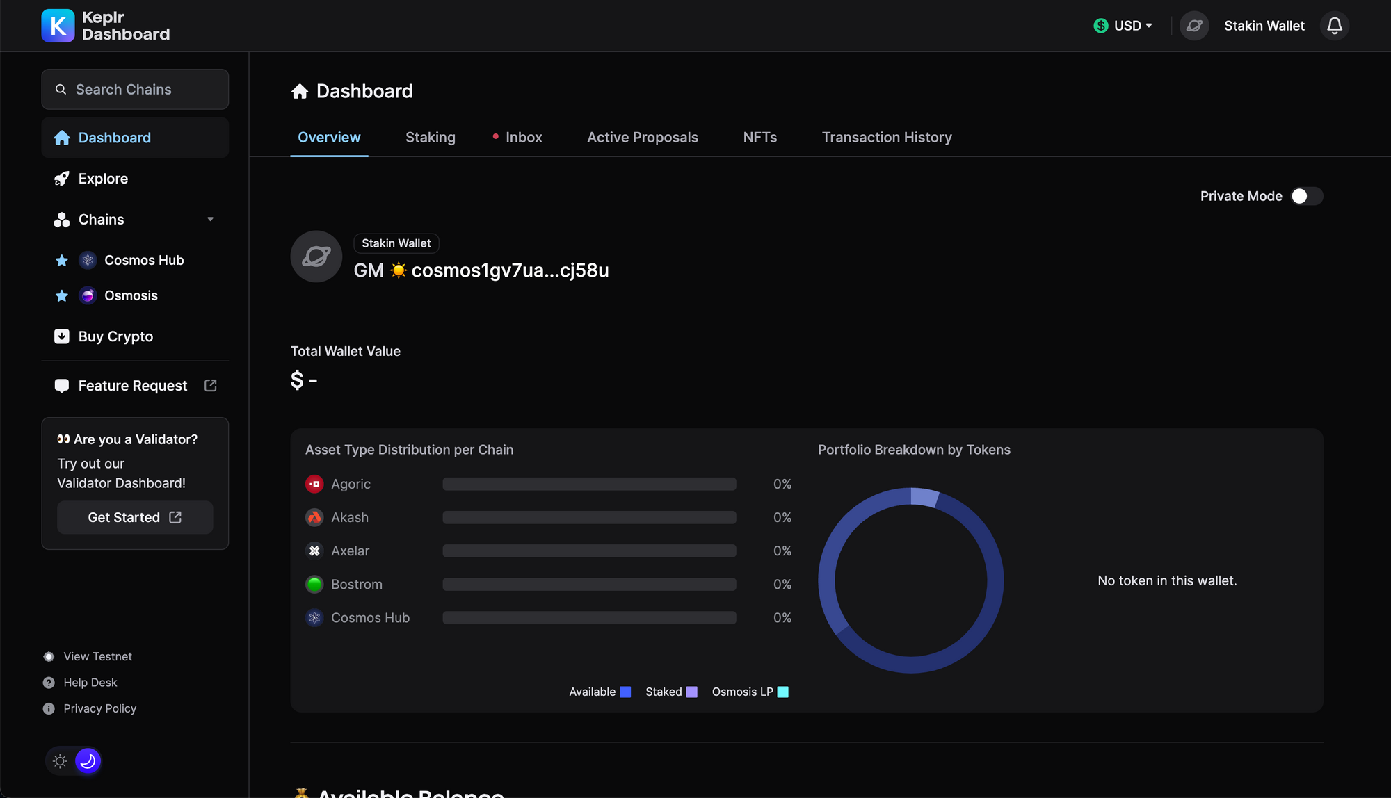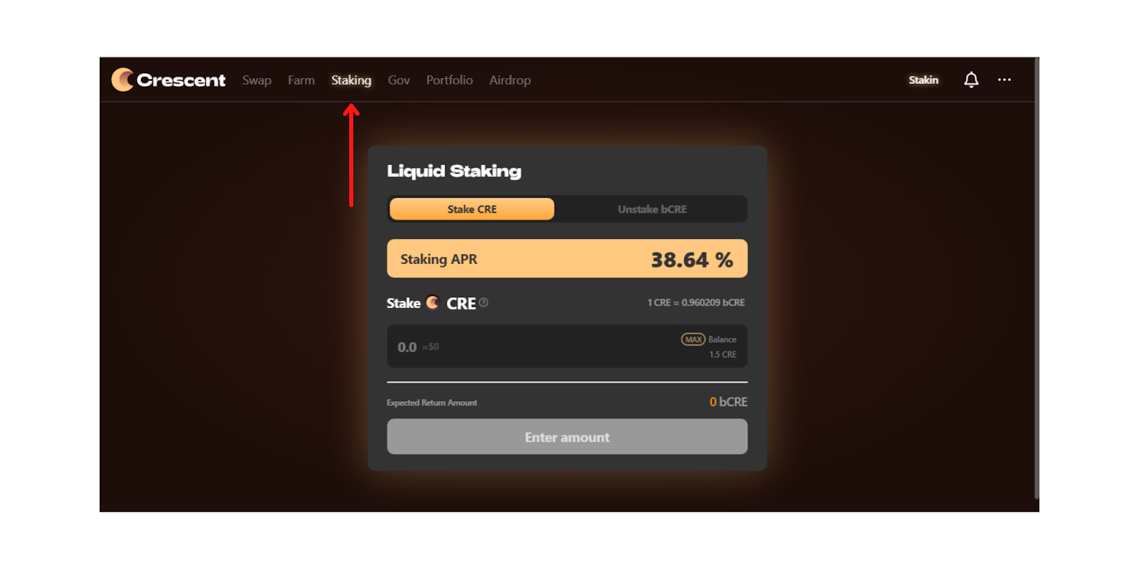 Go to the “Staking” tab on the top menu. Your interface should look similar to the one in the image below.