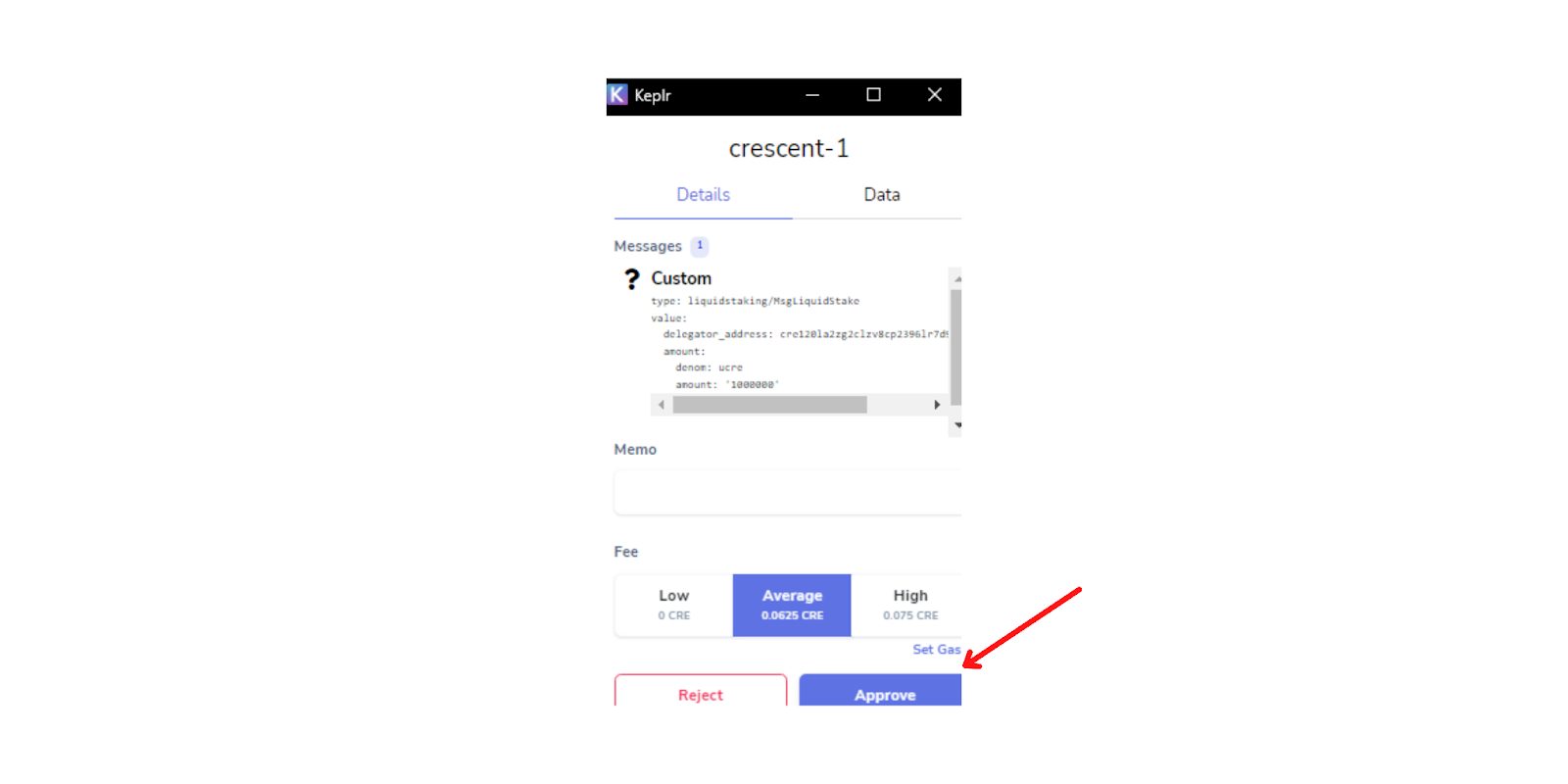 Enter the number of tokens you want to stake and click “Stake” and a Keplr pop-up will appear for you to review details and select the transaction fee; when ready, click “Approve”.