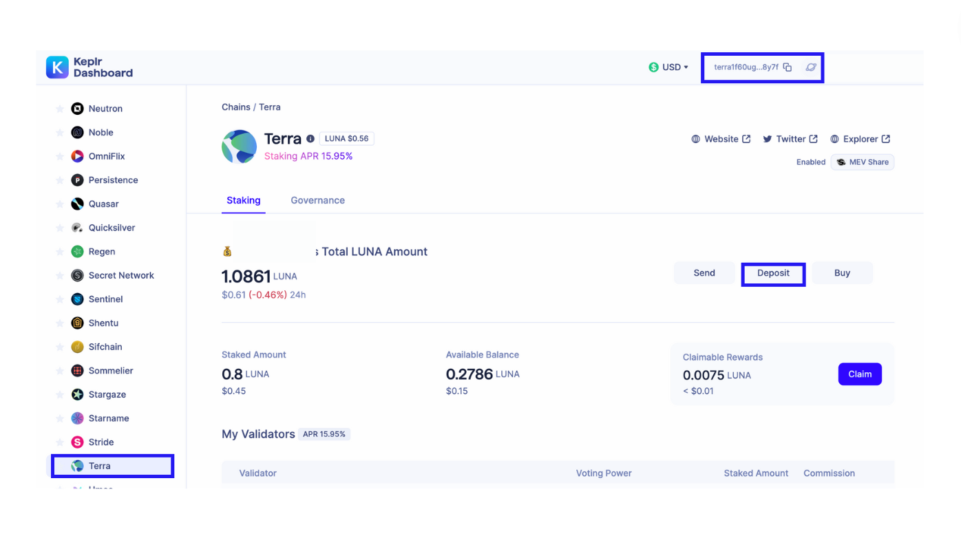 You can deposit your $LUNA by selecting "Terra" on the left menu under assets in the Keplr dashboard. After that, copy the public wallet address on the top right of your dashboard or click on "Deposit" to copy the address there.