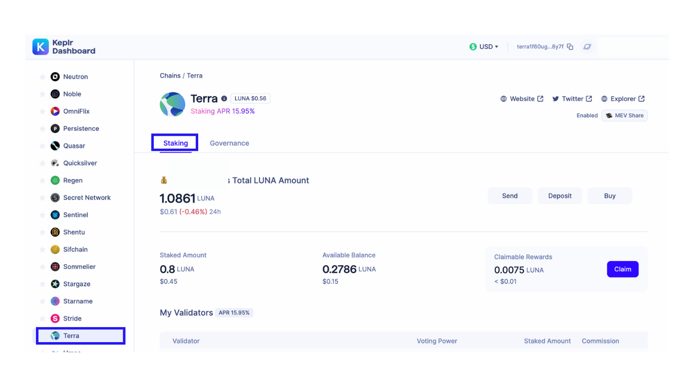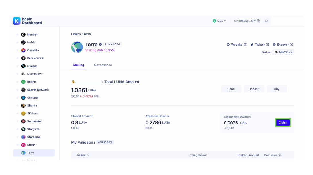 To claim, simply go to the staking tab of Terra in the dashboard. On the right side, select "Claim". Confirm the transaction in your wallet by selecting "Approve". That's all there is to it; you've now claimed your rewards.