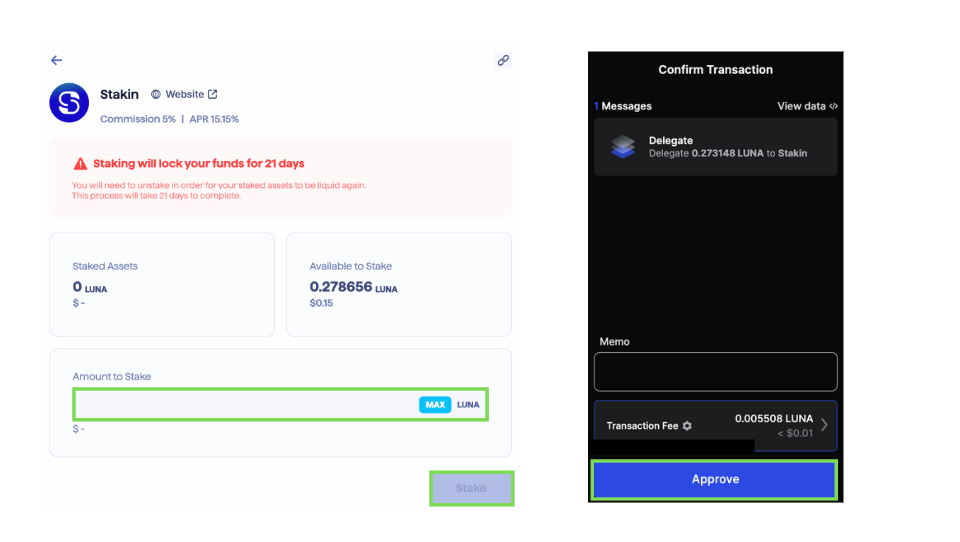 Select "Stake" to continue once more. Read through the pop-up with the transaction info and select "Approve" if it's all okay.