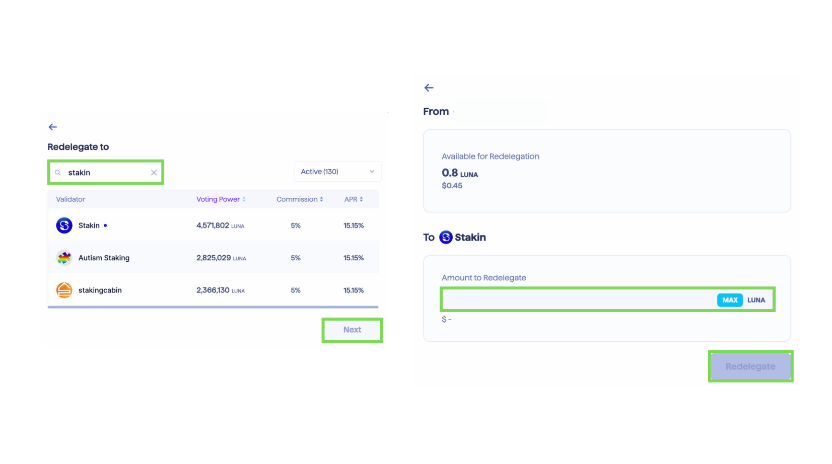 You'll now see the amount available for redelegation. Fill out how much $LUNA you'd like to redelegate and select "Redelegate" to confirm. In the pop-up, confirm their transaction by selecting "Approve". That's all; you've now redelegated your $LUNA.