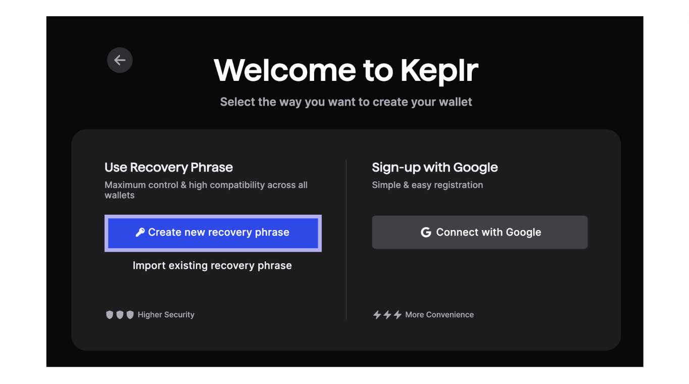 To continue, Keplr will ask you to select a new recovery phrase or to connect with Google. In this guide, we'll use the Recovery Phrase.