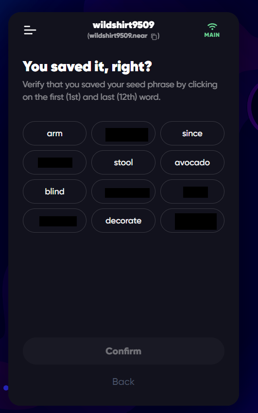 Next, you will be prompted to verify that you’ve successfully stored your seed phrase by selecting the First and the Last word of the security phrase.