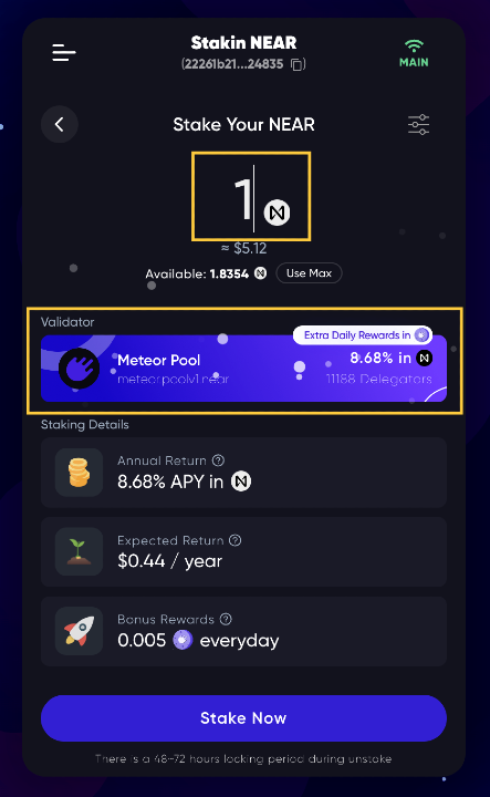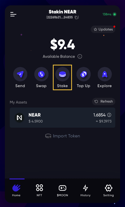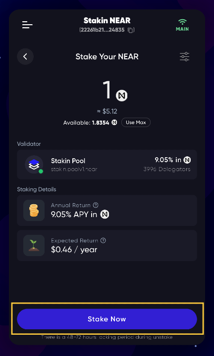 After topping up your wallet, you can proceed with Stakin your NEAR tokens.