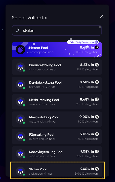 Congratulations! You’ve successfully staked your NEAR tokens with Stakin, by using the Meteor wallet.