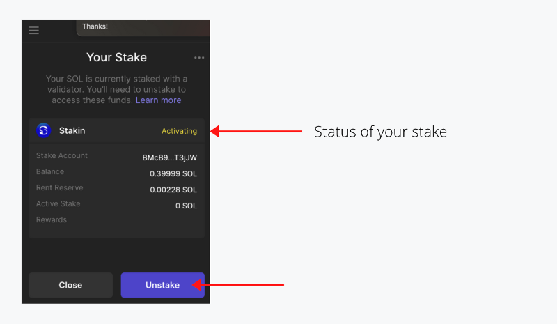Now, let’s say you’ve changed your mind and would like to unstake your assets. In the same validator dashboard as you can see your rewards (see image above) select “Unstake”. Now, wait for your unstaking to be confirmed and that is it. However, please note: you cannot unstake your assets while they’re still in the activating stake phase. Furthermore, only after the cooldown phase (which will be mentioned in your wallet), can you withdraw or unstake your assets. You will then need to wait for a few epochs before receiving the assets back into your wallet.