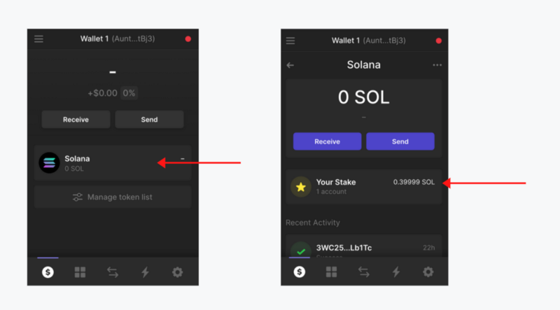 In the Phantom Wallet dashboard, select “Solana” (see image on the left, below). Next, select “Start Earning SOL”.