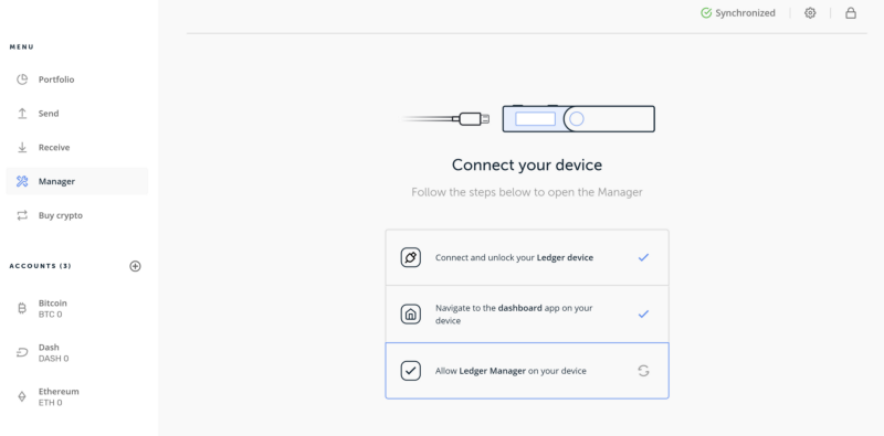 Then, go to the Manage page and allow the Ledger Manager on your Nano S by connecting your device, and then by pressing the right button on your Ledger.