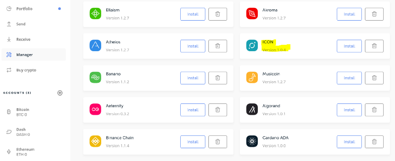 Once your Ledger Nano S is connected, you should go to the app catalog and choose ICON to install it.