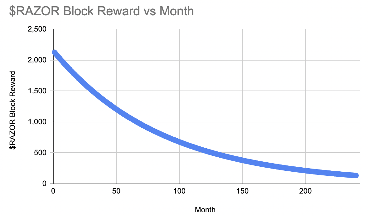 Razor Network’s utility token is called $RAZOR, and is an Ethereum Mainnet token standard known as ERC-20. Within the ecosystem, $RAZOR is required for security such as staking, governance decisions, transactions etc. According to Coinmarketcap, the total initial supply is 1,000,000,000 $RAZOR. At genesis, the block rewards were set in such a way to encourage staker participation, over time the block rewards will decrease.