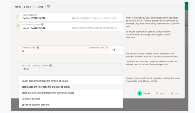 On the staking dashboard, select “Account actions” and then “+Nominator” (see image above). A pop-up will appear. You can select a Stash Account and a Controller account (top two) on the pop-up, then fill in the bond amount and select “Next”.