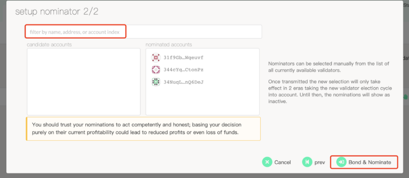 It is possible to select up to 16 different validators. You can select them by address, name, or click on them in the validator list. When you finish selecting, press “Bond & Nominate”.