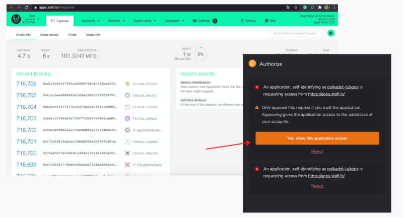 To start nominating on StaFi, first go to https://apps.stafi.io/#/explorer. If it’s your first time navigating this website, you will be asked to authorize the application via a pop-up. Select: “Yes, allow this application access” to continue.