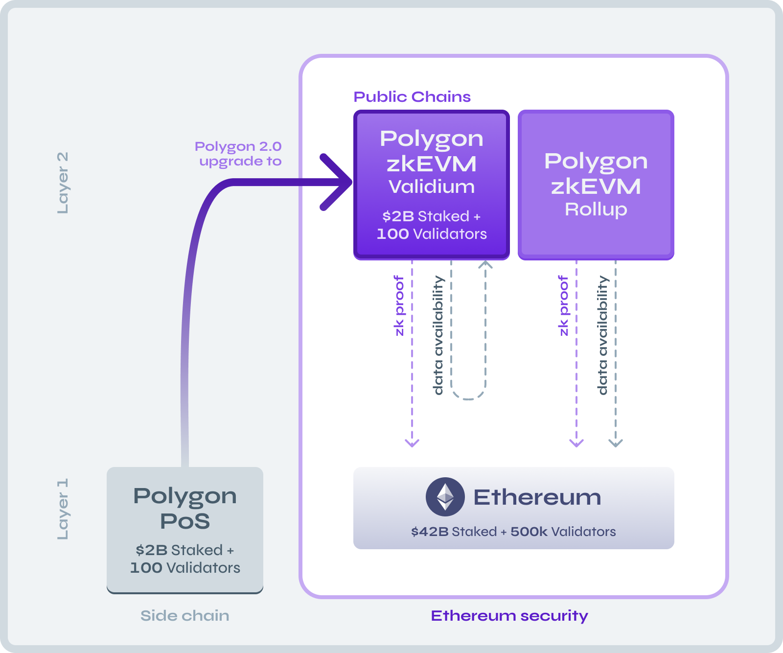 In this upgrade, Polygon is aiming to use ZK proofs to power all of their scaling solutions on Ethereum and no longer be a sidechain by becoming a validium. Validiums differ from rollups and sidechains, as they only post the validity proof back to Ethereum, not the actual transaction data of executed transactions.