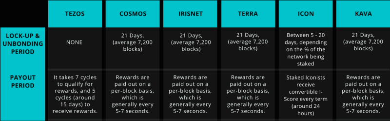 In the table below, you can find the lock-up and unbonding period as well as the payout period of each protocol mentioned above.