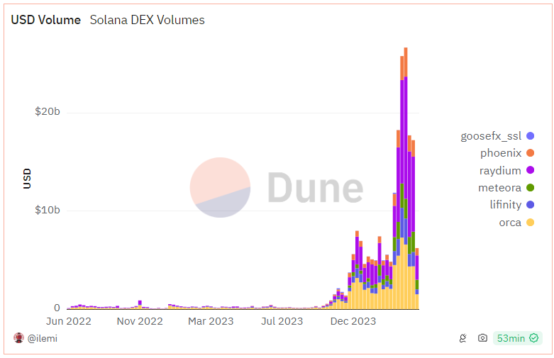 Dex volume on Solana continues to grow, with memecoin trading largely accountable for the recent boom. On March 18, DEX volume on Solana marked $26.7 billion. The top DEXs on Solana are Orca, Phoenix, Radium, Lifinity and Saber. In addition, Jupiter stands out as the key liquidity aggregator for Solana, offering the widest range of tokens and the best route discovery between any token pair.