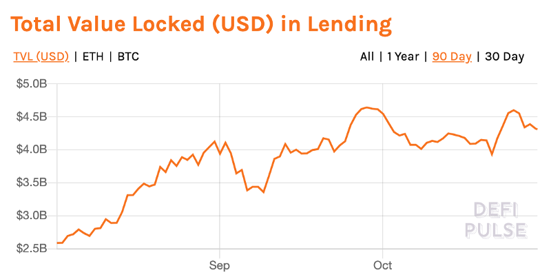 The total value locked in DeFi applications currently stands at $11 billion, according to DeFi pulse at the time of writing. Of that, $4,32 billion is locked in lending. Compound and MakerDAO, both DeFi applications build on Ethereum, are the top two in lending. Both platforms have over $1 billion secured in lending.