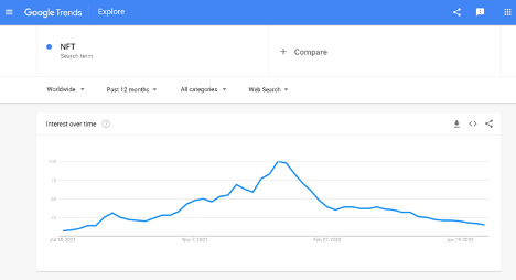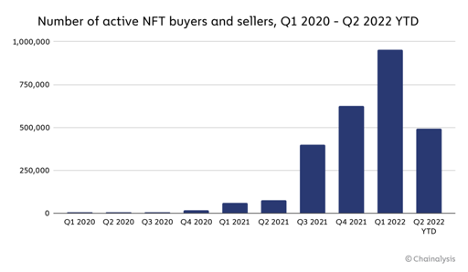 Even the BAYC is not immune to market conditions, with floor price falling below USD$100,000, down 78% since late April when it was valued at USD$429,000. A series of conditions have brought the NFT value down, such as a general decrease in the hype (as per Google Trends), the market’s recent downturn, fear of scams, and rising inflation rate resulting in users being less inclined to undertake risky investments. The data shows a rapid drop in unique buyers, from over 900k in Q1 2022 to nearly 500k in Q2 2022.