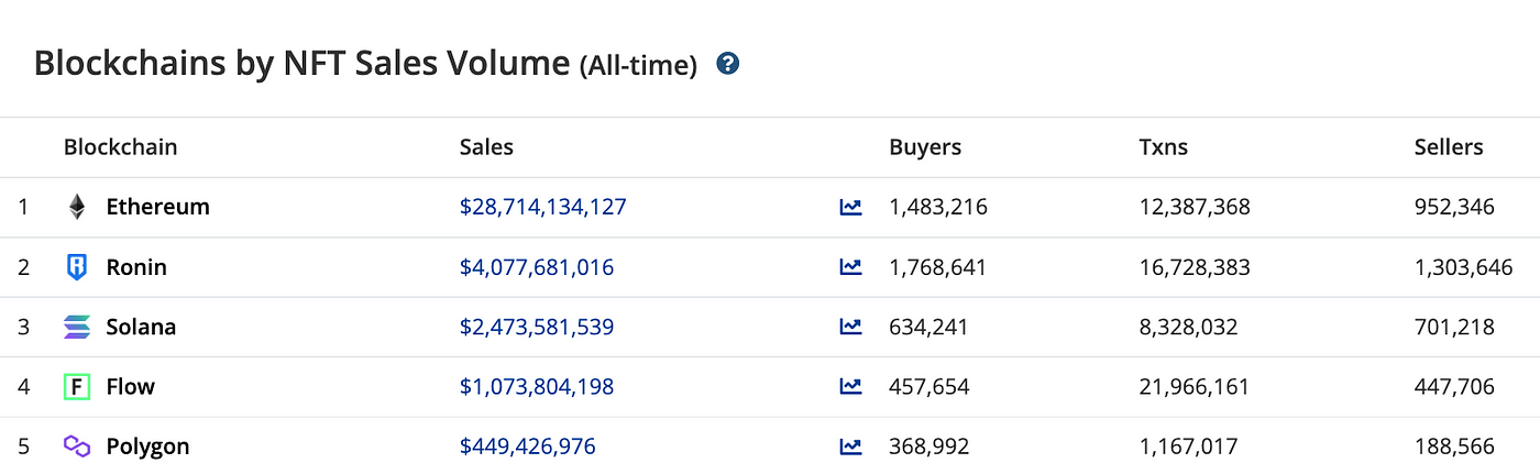 In terms of all-time NFT sales volume, Ethereum stands apart, with USD$28 billion, followed by Ronin, home of Axie Infinity, with USD$4 billion, and Solana with USD$2.4 billion. It is worth noting, as Ethereum is the largest network, it suffers from congestion which in turn creates high gas fees.