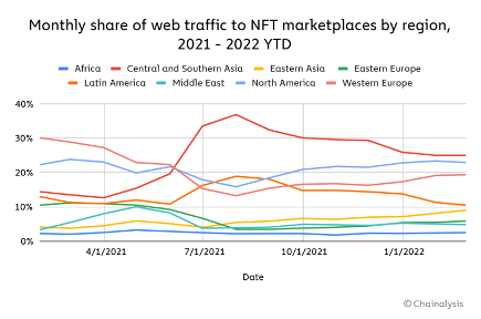 The web traffic of the significant NFT marketplaces shows that NFT attracts users from all corners of the globe, with Central and Southern Asia leading the charge, followed closely by North America and Western Europe.