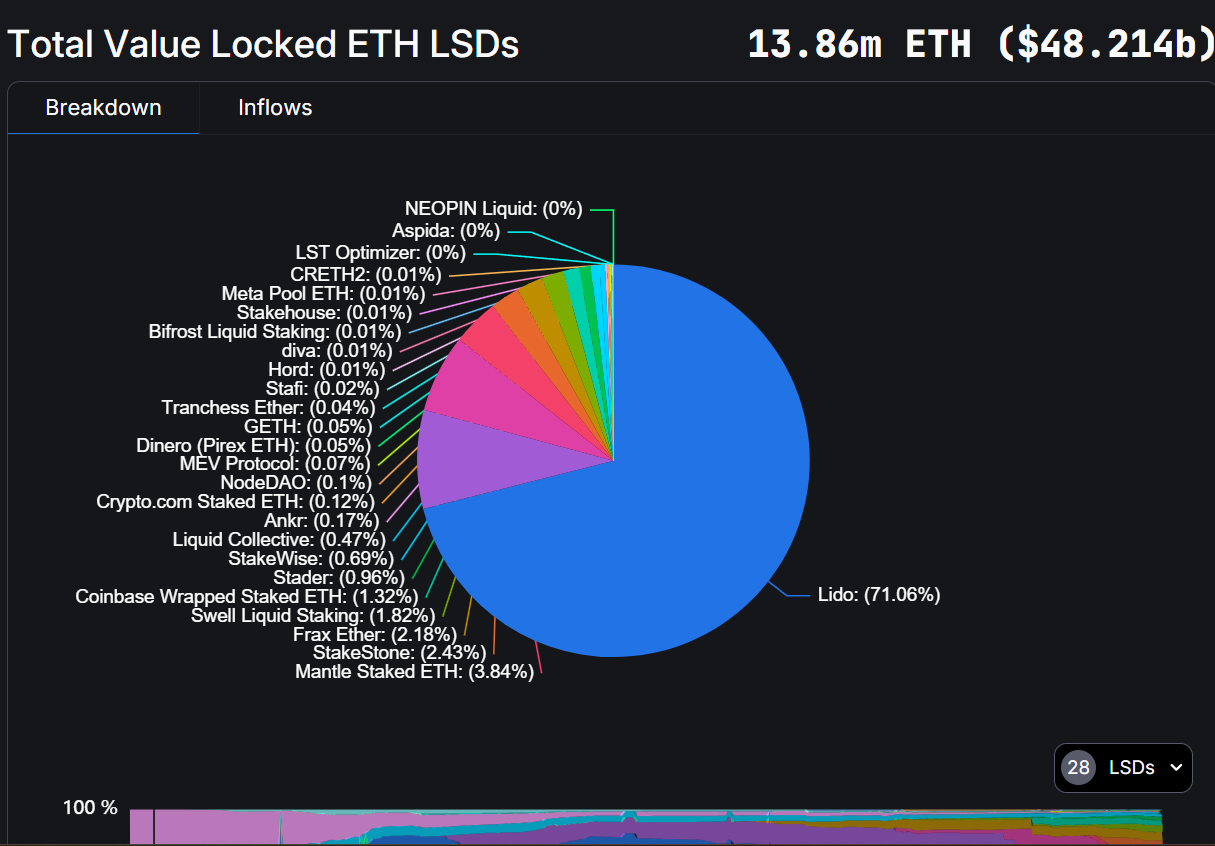 Lido’s dominance amongst other LSDs on Ethereum is apparent. Representing a total of 71.06%, it’s clear Lido has a distinct market share amongst other solutions like Rocket Pool and Frax Ether.