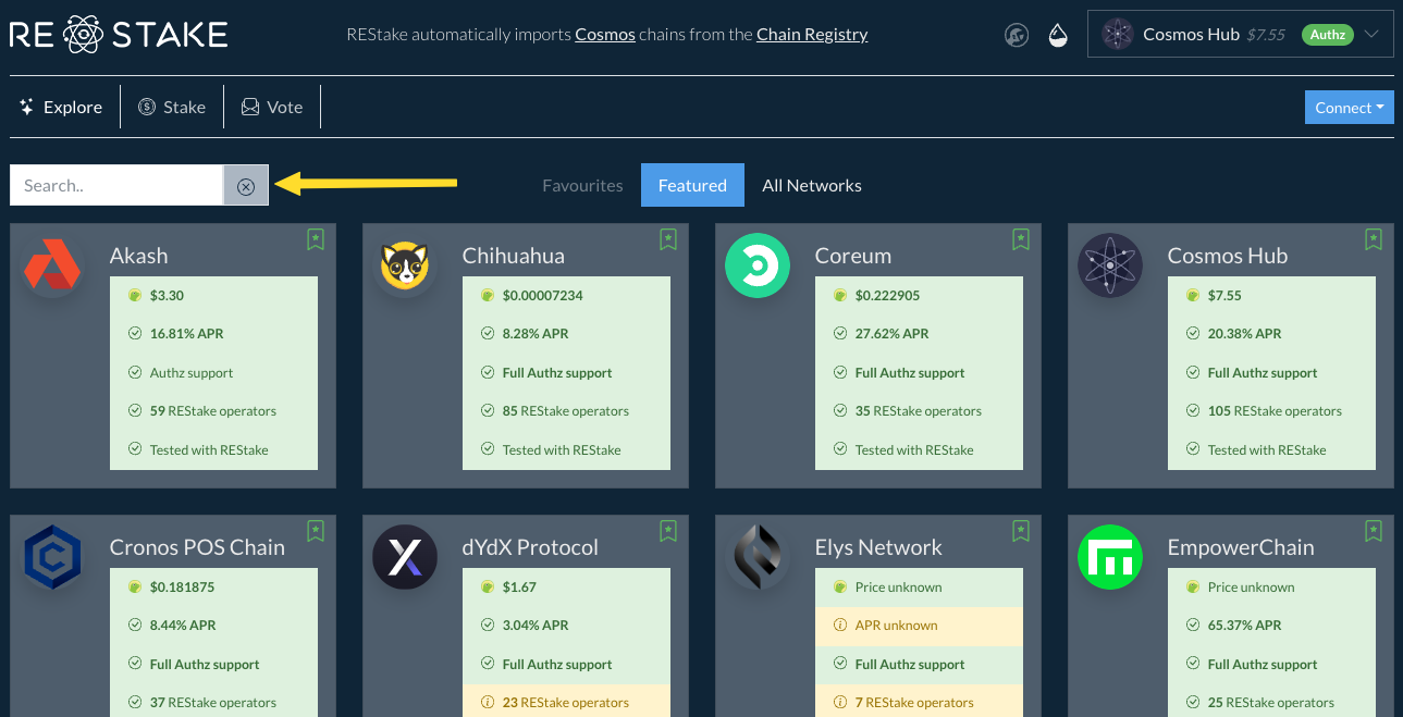 At the moment of writing this article Stakin supports REStake on the following networks: Agoric, Akash, Axelar, Celestia, Cosmos Hub, Cronos POS Chain, Kava, Persistence, Saga, Sei, Synternet, Terra, Terra Classic, UX Chain, Xion, and Zetachain.