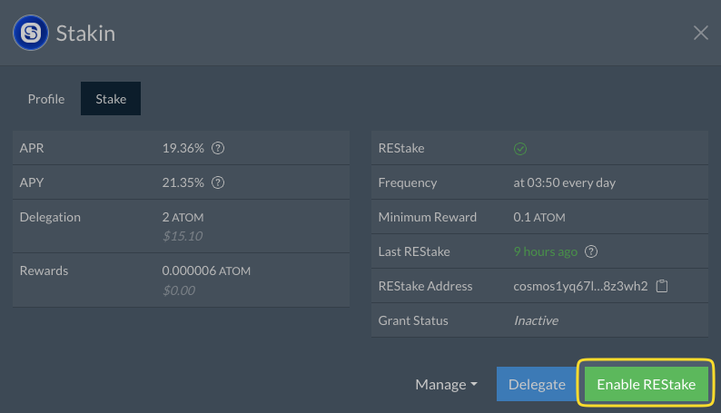 - Review the parameters, such as frequency, minimum reward for restake and also when was the last REStake to confirm it is active.